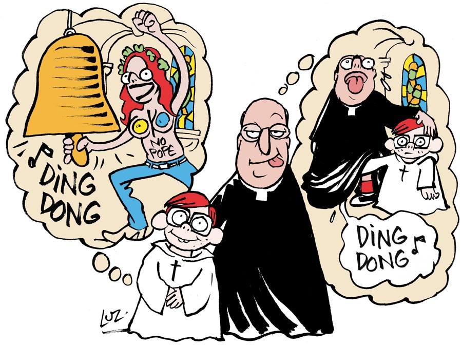 En su último número los “humoristas” del pasquín Charlie Hebdo, “compañeros que ejercen un servicio necesario” según el portavoz de la Conferencia Episcopal, colocan una imagen en la que aparece un sacerdote denigrado como un vulgar pedófilo, mientras un niño sueña con que las FEMEN toquen las campanas de la Catedral.