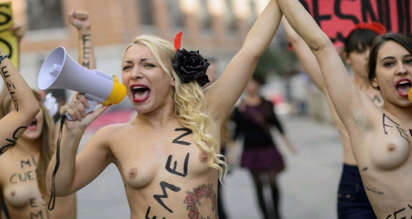 A seno scoperto con sopra la scritta in pennarello nero: “L’aborto è sacro”. Cinque attiviste del gruppo “Femen” hanno interrotto una manifestazione anti-aborto a Madrid, dove migliaia di persone si erano riunite per chiedere al governo una nuova legge sull’interruzione di gravidanza.