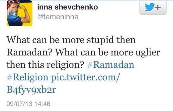 Le 9 juillet dernier, à la veille du mois de Ramadan, Inna Shevchenko, leader des Femen et nouvelle Marianne timbrée, postait un tweet pour le moins offensant envers les musulmans.