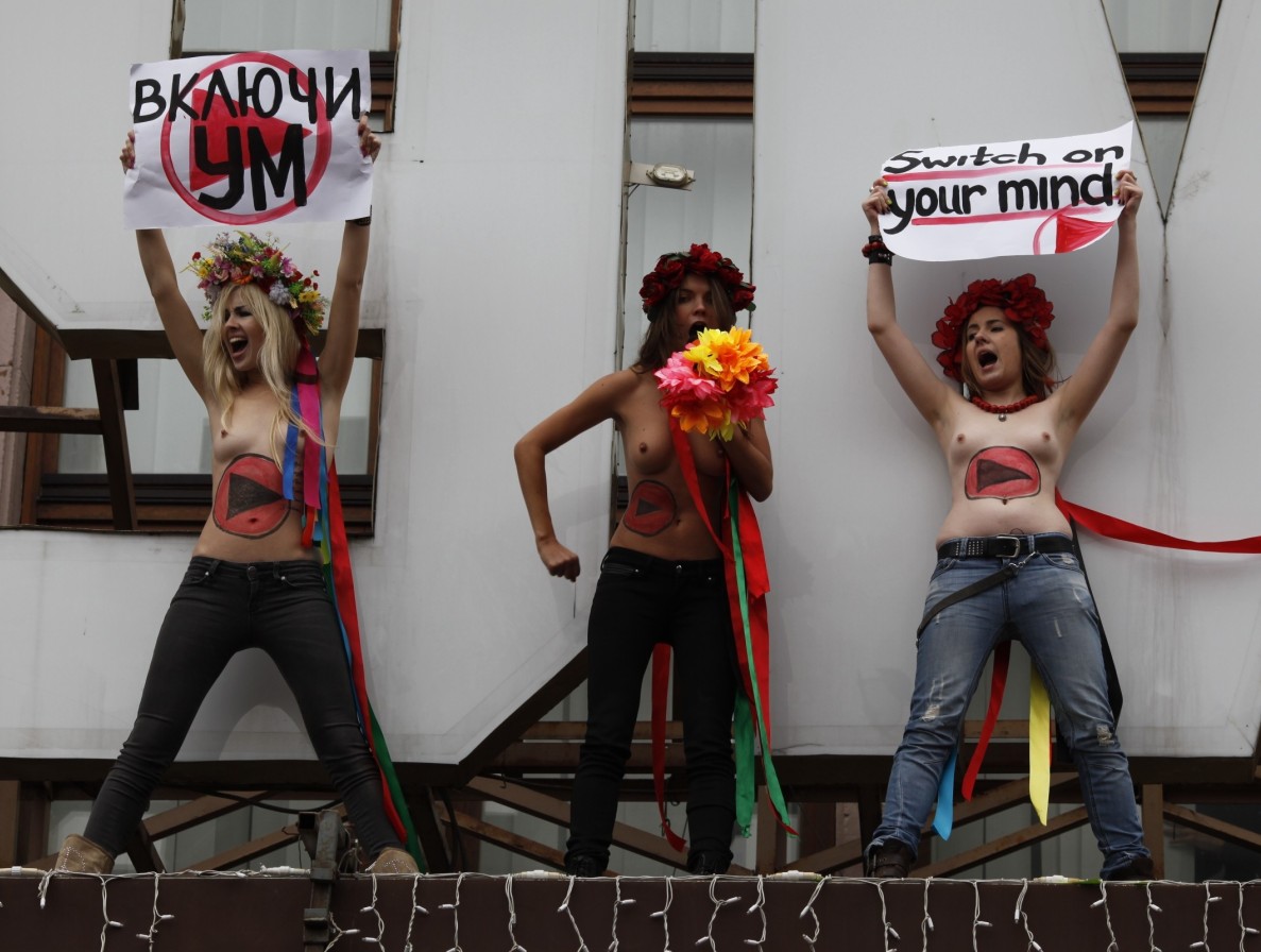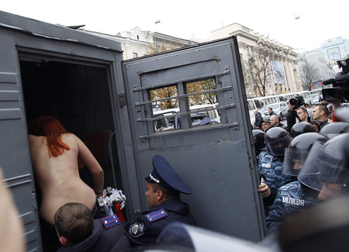 Op het plein waar de aanhang van Timosjenko zich in afwachting van het vonnis had verzameld, beklom een aantal activistes de overkapping boven de ingang van een groot warenhuis om haar boodschap te verkondigen en daarbij een beroep te doen op het gezonde verstand –