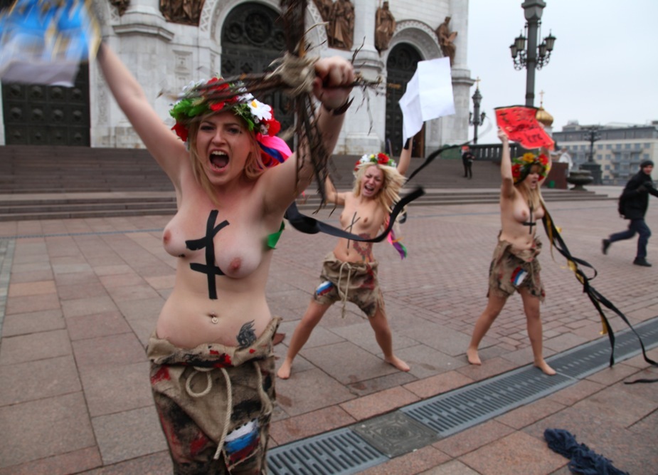 Wij zijn blij met de protestacties van het Russische volk, dat het niet langer pikt dat er met verkiezingen gefraudeerd wordt. We kijken uit naar de geboorte van een nieuw Rusland zonder dieven, oplichters en politieke gevangen,’ verklaarden de activistes bij de ingang van het bolwerk van de Poetin dictatuur.